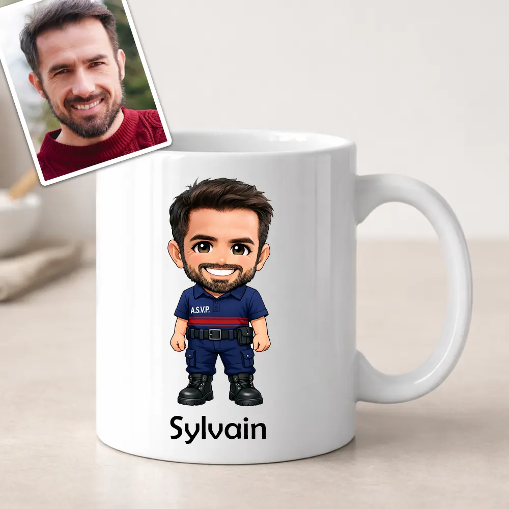 Ce mug personnalisé ASVP convient aussi bien pour un homme que pour une femme. Il permet de créer un visuel sur mesure à partir d’une photo, afin d’obtenir un personnage au style sympathique, expressif et valorisant. C’est une excellente idée pour faire plaisir à un proche, à un collègue, à un agent en poste ou à une personne attachée à son métier. Grâce à la personnalisation, chaque mug devient une création unique, pensée pour ressembler au mieux à la personne représentée.
