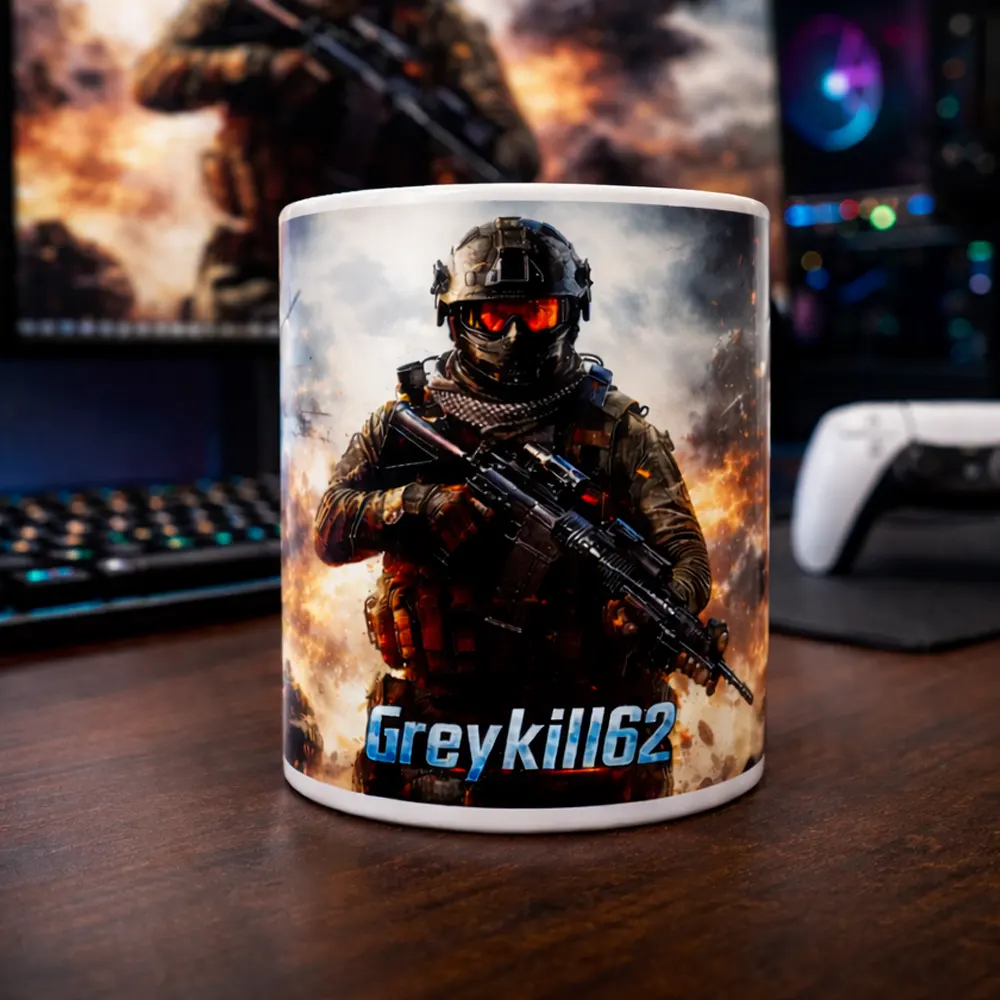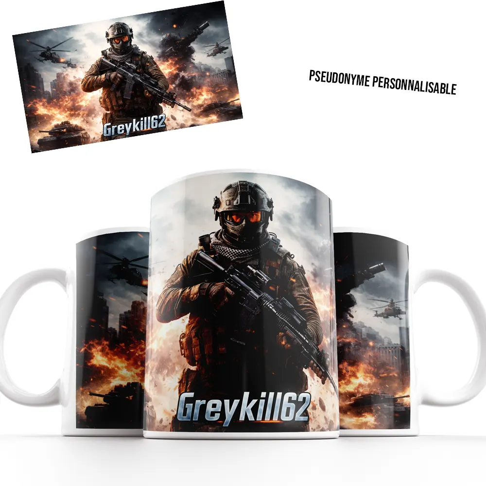 Affichez votre pseudo avec ce mug style Battlefield personnalisé. Une tasse gamer au design spectaculaire inspiré des jeux de guerre et des univers FPS.